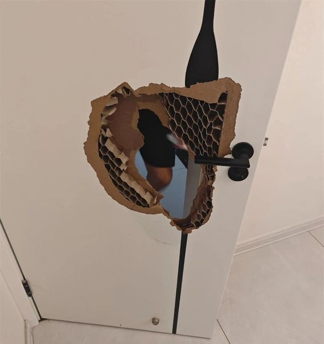 如果不是像我一样被坑,我相信没人会愿意买这种蜂窝纸填充的室内门吧?